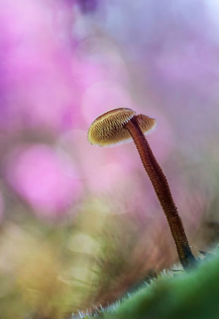 Al ser una especie que ya había fotografiado en alguna otra ocasión, esta vez tenía claro como quería fotografiarla así como el tipo de iluminación que quería para ella. Además la flores de brezo que crecían detrás de ella me proporcionaban un bonito toque de color que contrastaba con los tonos amarillos de la parte de las agujitas y de la esquina inferior izquierda. A su vez el verde del sustrato de musgo donde crecía también ofrecía un contraste agradable con los tonos rojizos del pie y sombrero.